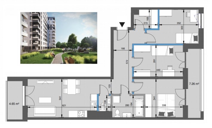 • Two loggia-type balconies with an area of 4.65 m² and 7.26 m²