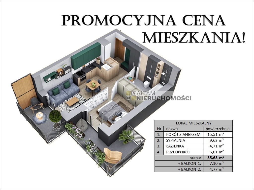 - dwa szerokie balkony o pow. 7,10 m² oraz 4,77 m²