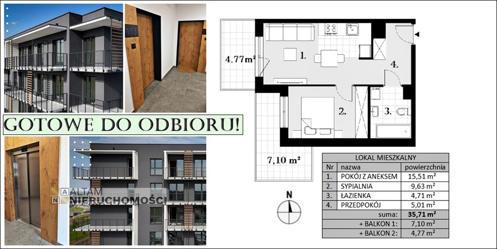 • dwa szerokie balkony o pow. 7,10 m² oraz 4,77 m²