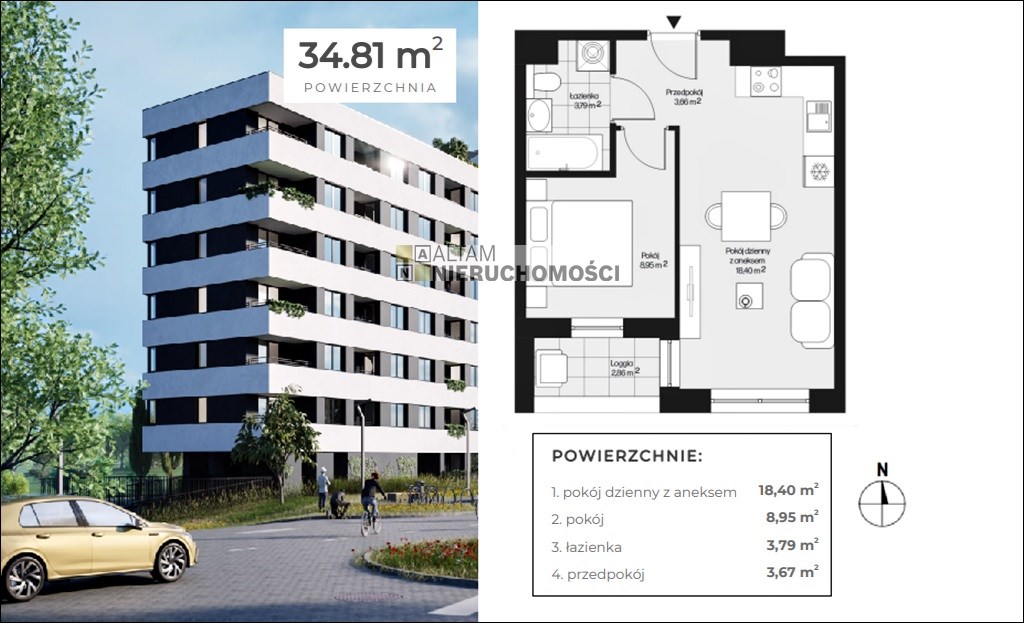 - pokoju dziennego z aneksem kuchennym: 18,40 m²