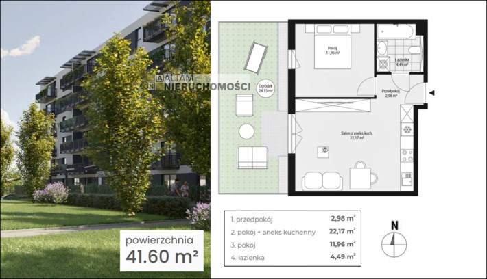 Przedmiotem sprzedaży jest 2-pokojowe mieszkanie z aneksem kuchennym o powierzchni 41,60 m² zlokalizowane na parterze (0/5) z ogródkiem. Cena zawiera VAT. Mieszkania oddawane są w standardzie deweloperskim+.
