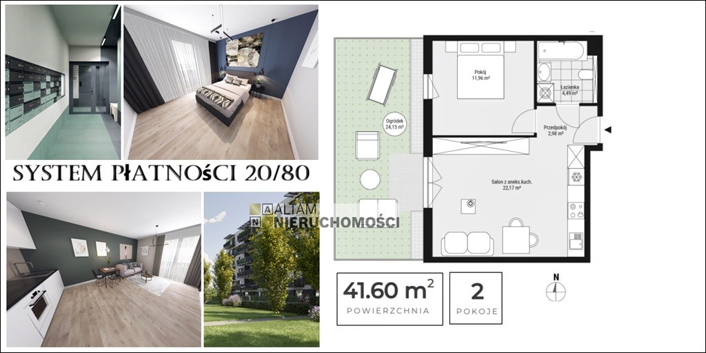 Przedmiotem sprzedaży jest 2-pokojowe mieszkanie z aneksem kuchennym o powierzchni 41,60 m² zlokalizowane na parterze (0/5) z ogródkiem. Cena zawiera VAT. Mieszkania oddawane są w standardzie deweloperskim+.