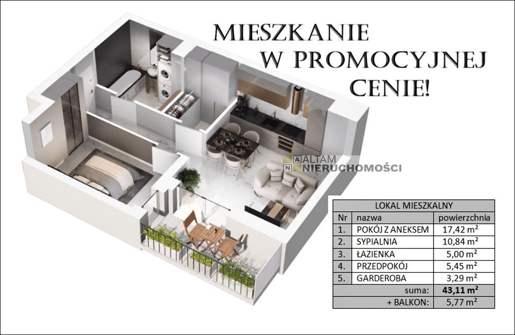 o powierzchni 43,11 m² zlokalizowane na I piętrze (1/8) z szerokim balkonem.
