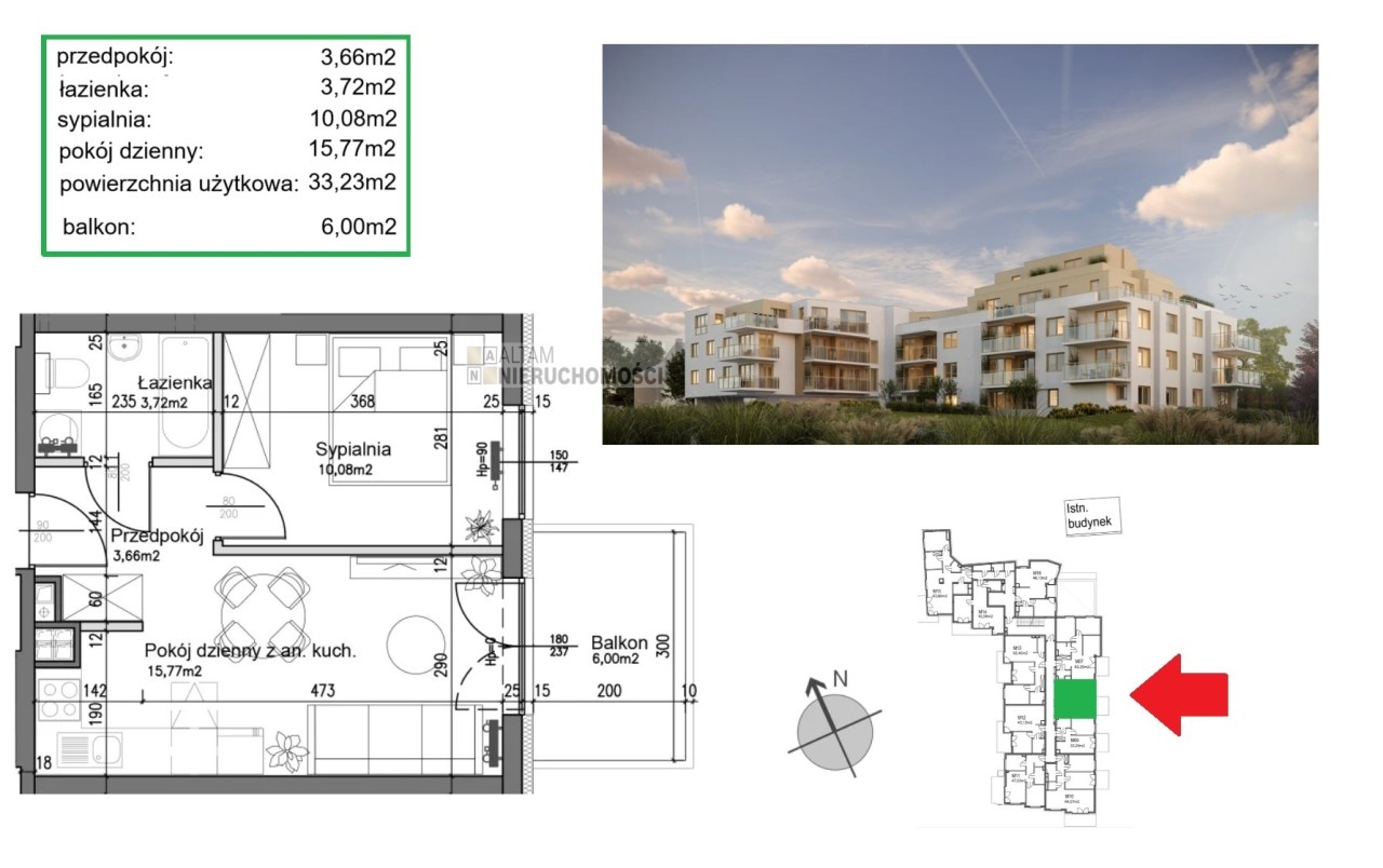 Przedmiotem sprzedaży jest dwupokojowe mieszkanie o powierzchni 33,25 m² z balkonem zlokalizowane na I piętrze (budynek 3-piętrowy z windą, dostępne także inne kondygnacje). Cena zawiera VAT. Mieszkania oddawane są w standardzie deweloperskim.