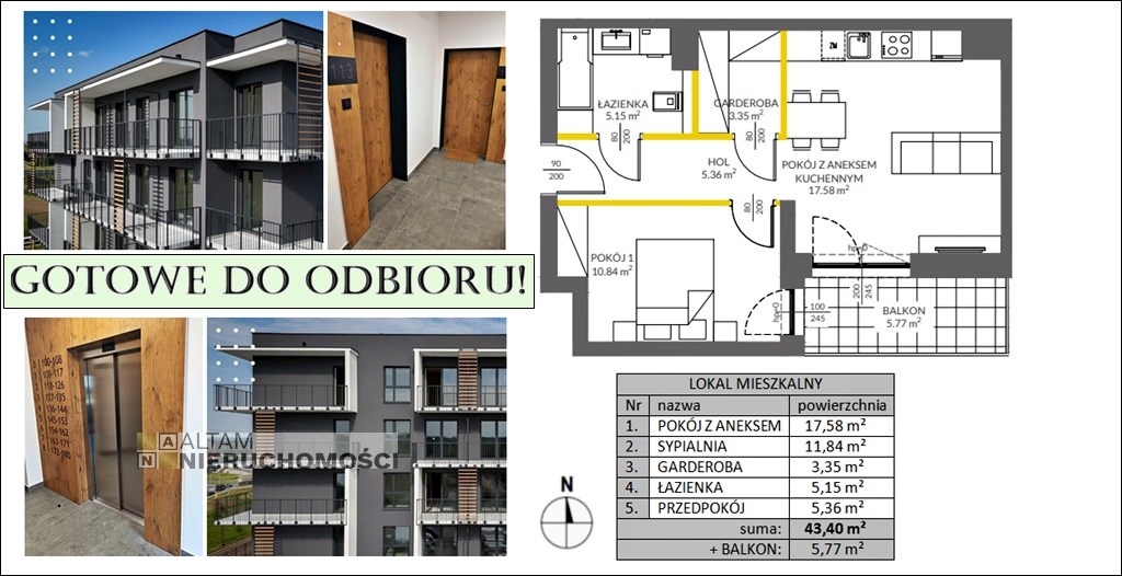 o powierzchni 43,40 m² zlokalizowane na VI piętrze (6/8) z szerokim balkonem.