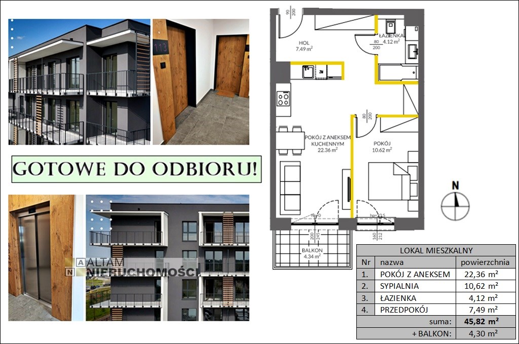 o powierzchni 45,82 m² zlokalizowane na II piętrze (2/8) z balkonem.