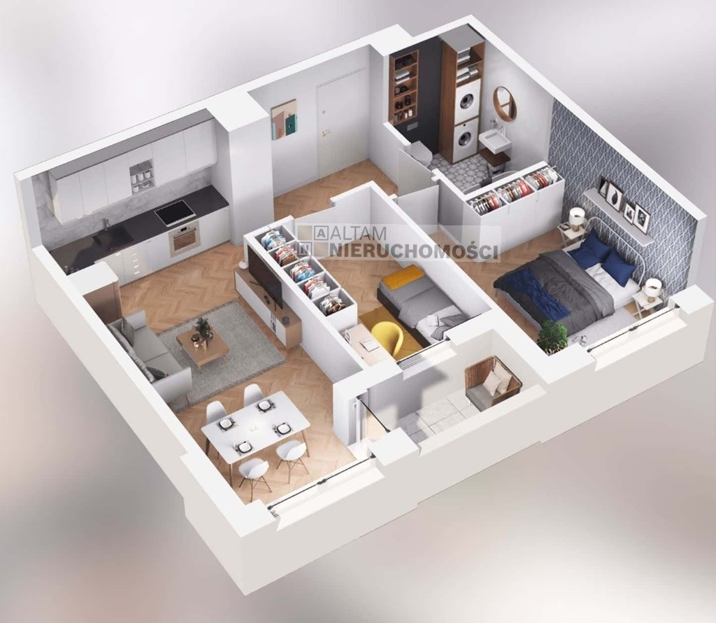 - pokój dzienny z aneksem kuchennym + 2 pokoje