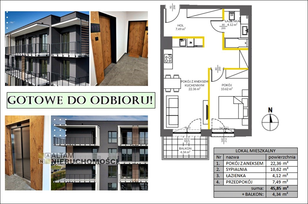 o powierzchni 45,85 m² zlokalizowane na IV piętrze (4/8) z balkonem.