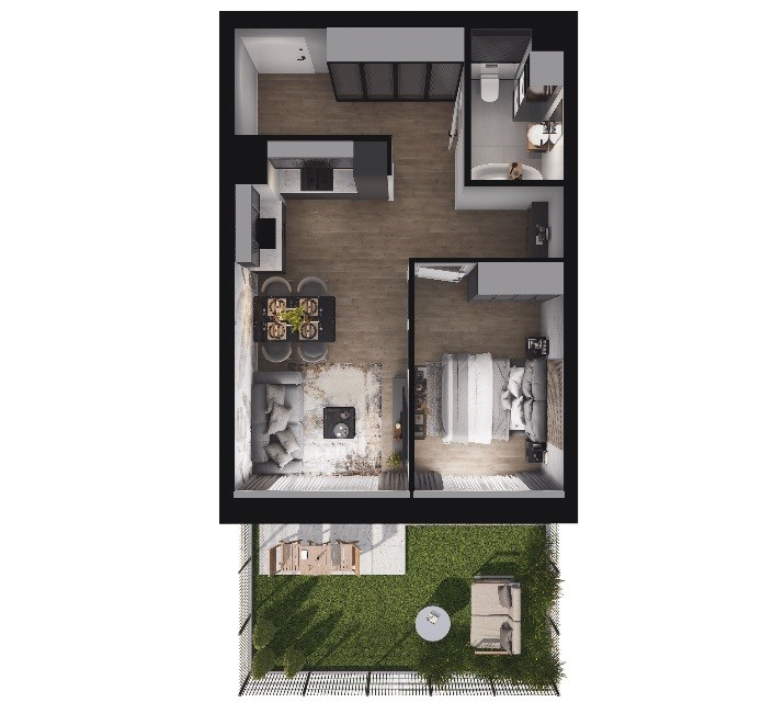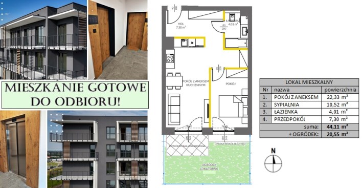 o powierzchni 44,11 m² zlokalizowane na parterze (0/8) z przynależnym ogródkiem.