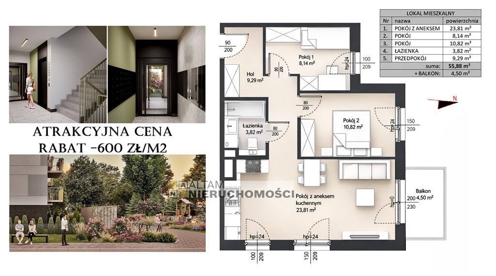 - pokoju dziennego z aneksem kuchennym: 23,81 m²