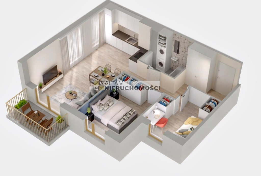 - salon z aneksem kuchennym + 2 pokoje