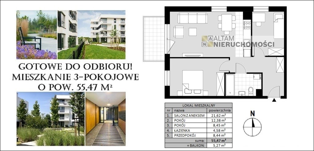 - dwóch pokoi: 12,38m² oraz 8,45m²