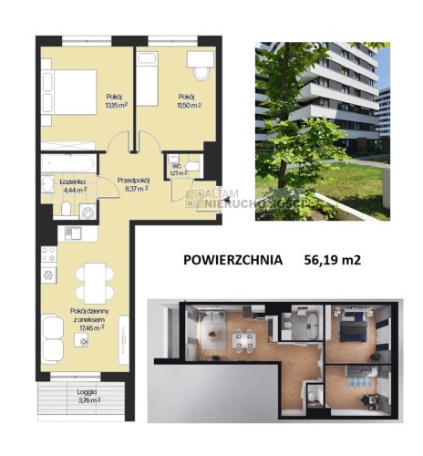 - pokój dzienny z aneksem kuchennym + 2 pokoje