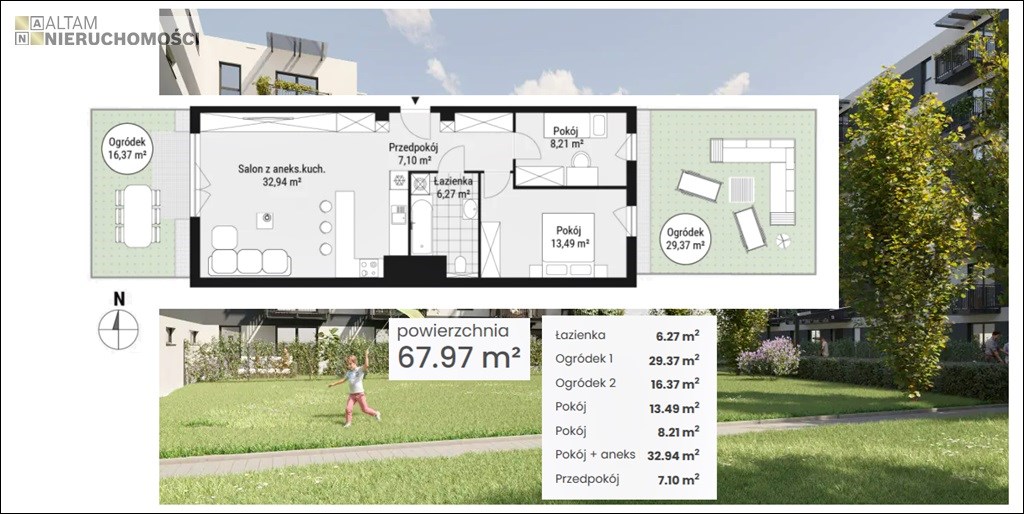 - dwa ogródki o pow. 29,27 m² oraz 16,37 m²