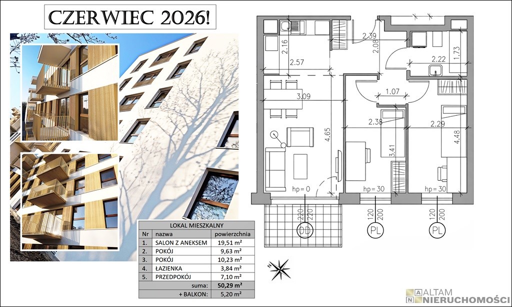 Przedmiotem sprzedaży jest 3-pokojowe mieszkanie z aneksem kuchennym o powierzchni 50,29 m² zlokalizowane na I piętrze (1/5) z balkonem.