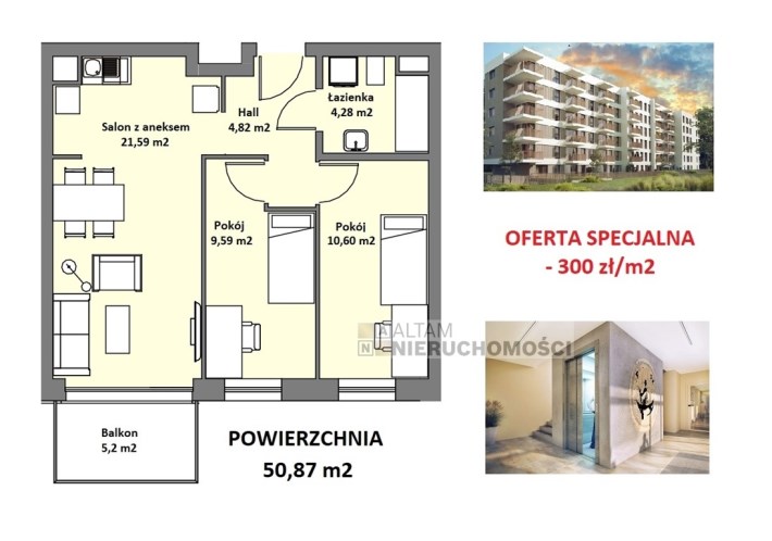 3 pokoje 1 piętro 50,87 m2 15 800,00 zł/m2