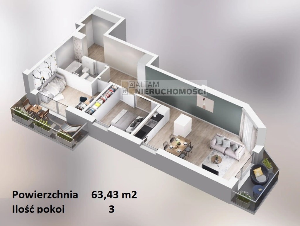 Przedmiotem sprzedaży jest 3-pokojowe mieszkanie z aneksem kuchennym o powierzchni 63,43m² z dwoma balkonami zlokalizowane na I-piętrze (budynek 6-piętrowy, dostępne także inne kondygnacje). Cena zawiera VAT. Mieszkania oddawane są w standardzie deweloperskim+.