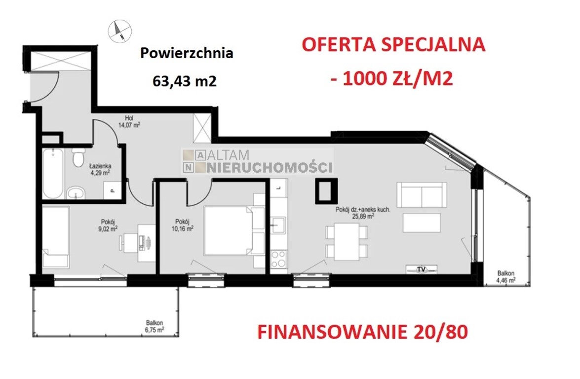 - 2 x balkon o pow. 6,75m2 oraz 4,46m2