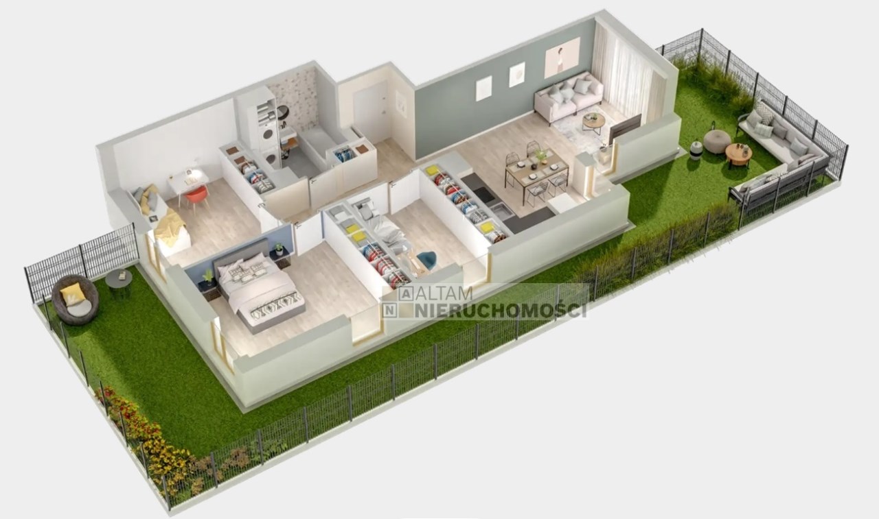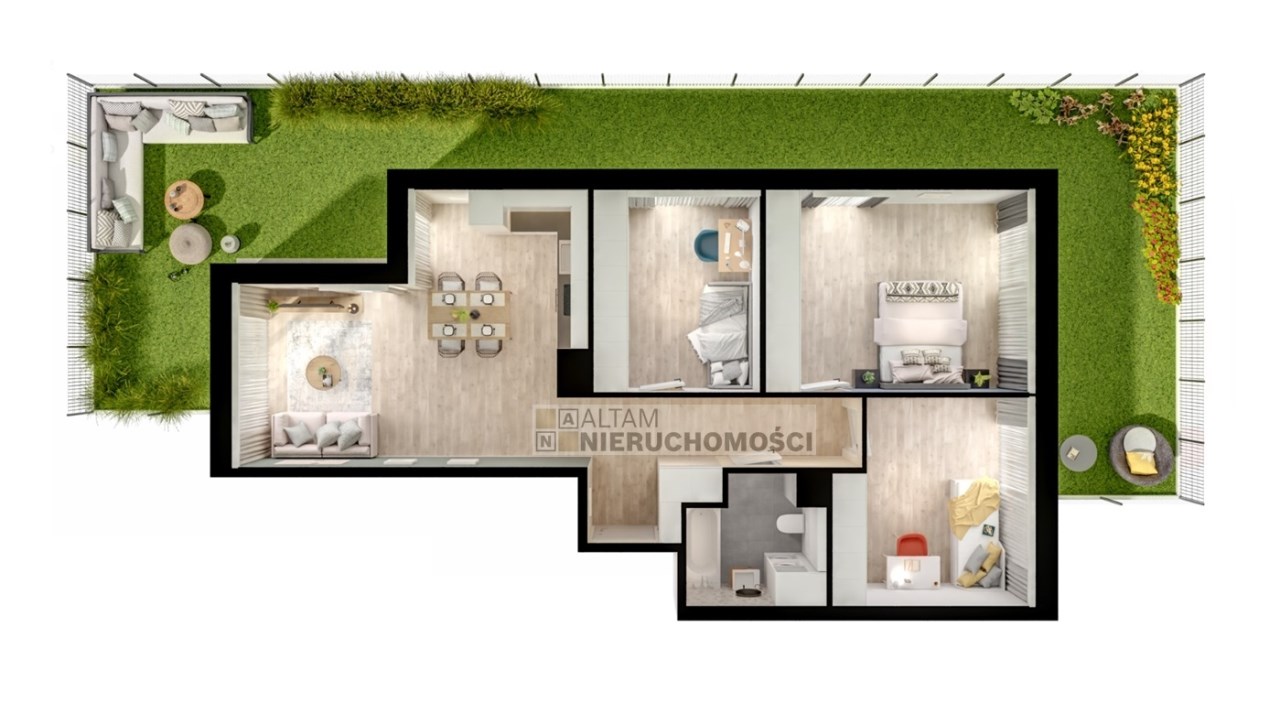 - salon z aneksem kuchennym + 3 pokoje