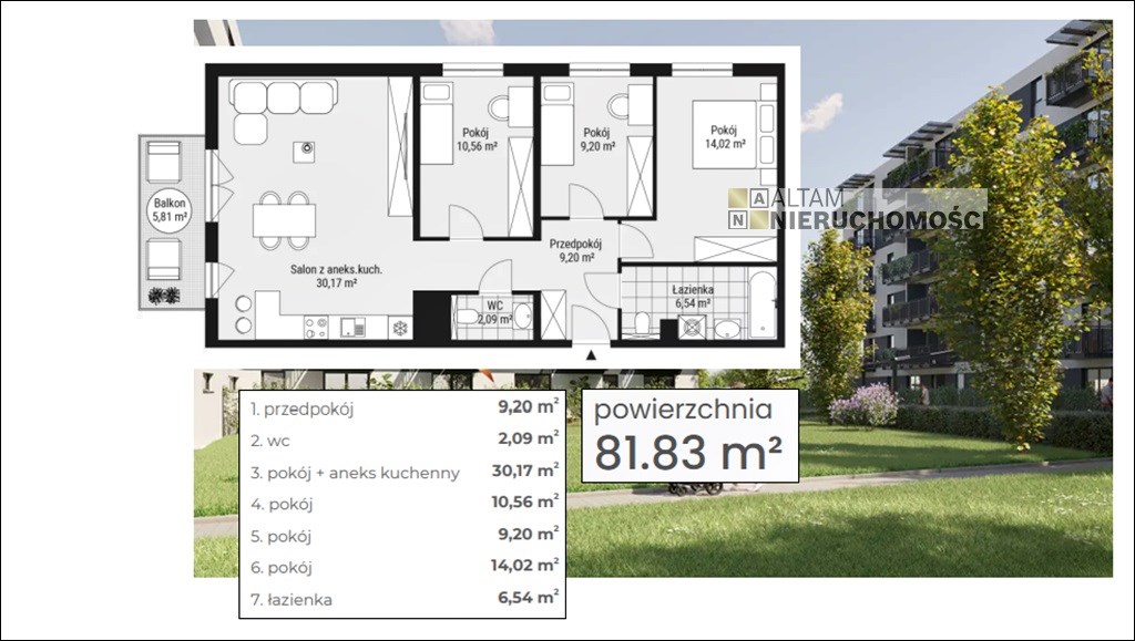 Przedmiotem sprzedaży jest 4-pokojowe mieszkanie z aneksem kuchennym o powierzchni 81,83 m² zlokalizowane na I piętrze (1/5) z szerokim balkonem. Cena zawiera VAT. Mieszkania oddawane są w standardzie deweloperskim+.