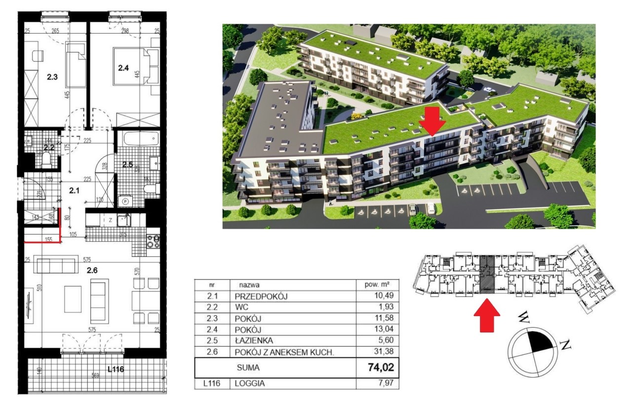 Przedmiotem sprzedaży jest trzypokojowe mieszkanie o powierzchni 74,02m² z balkonem zlokalizowane na drugim piętrze (budynek 3-piętrowy z windą). Cena zawiera VAT. Mieszkania oddawane są w standardzie deweloperskim +.
